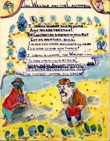 Walrus is a linguistic as well as a sonic kaleidoscope; a feast of linguistic invention: “crabalocker fishwife”, “semolina pilchard”, “elementary penguin”, “goo goo g’joob”, “see how they snied”. But even these fragments of apparent nonsense — like ‘Jabberwocky’ — contain linguistic and emotional meaning. In a way that I think would have delighted fellow bricolage enthusiast Carroll — Walrus weaves these into a tapestry of sources, ideas, allusions, alliterations, and quotes…