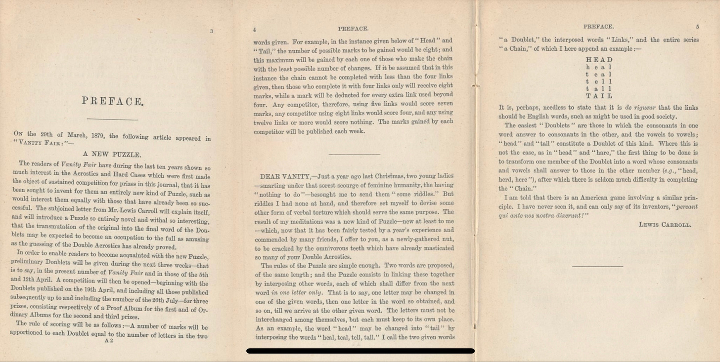 I’m grateful to Mark Russell-Richards for an exchange about the distinction between two Carrollian inventions: “word ladders” and Syzygies. (If you’re wordplay minded, you might enjoy this ‘doublet’ puzzle solver).